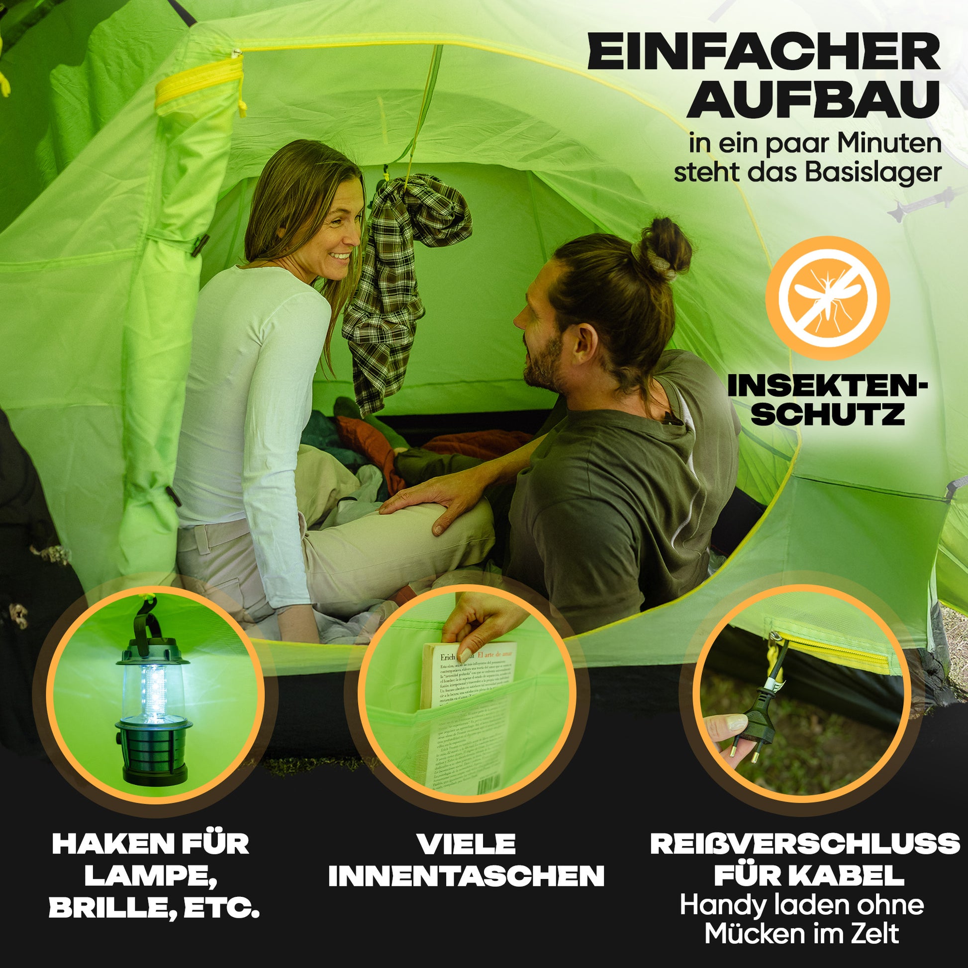 Ob Wochenendtrip, Trekkingtour oder Festival – das Cevedale 2 bietet dir zuverlässigen Schutz bei jedem Abenteuer. Mit seinem durchdachten Design ist es ideal für zwei Personen und lässt sich leicht im Rucksack verstauen.
